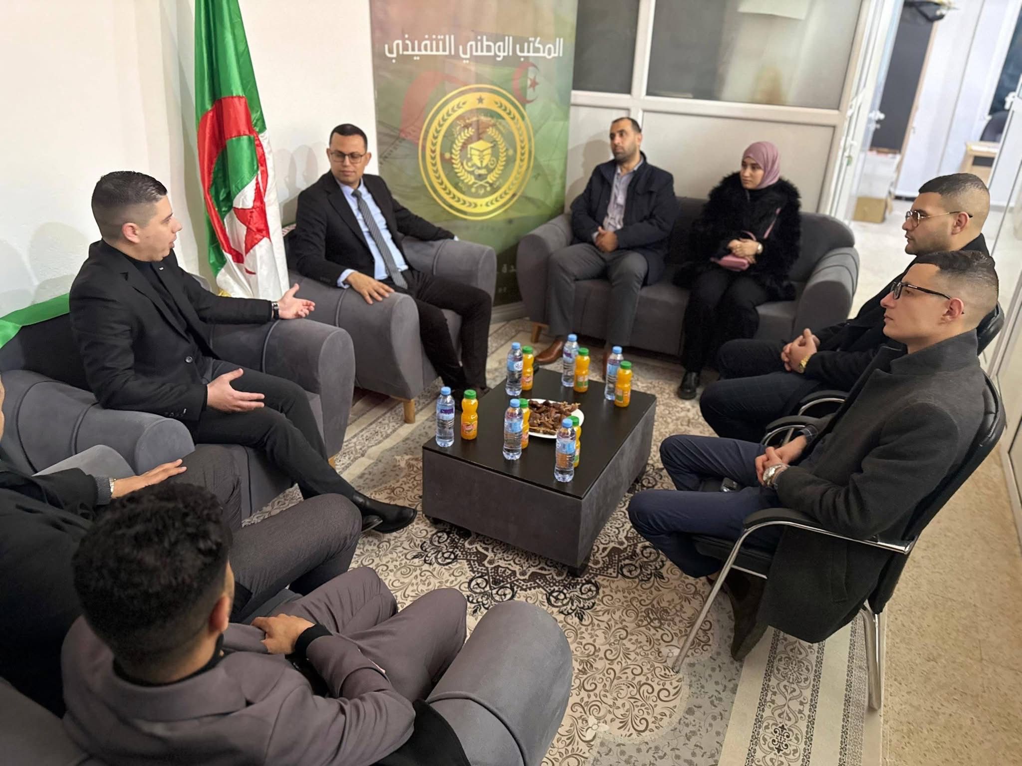 الجزائر - في إطار جولته إلى الجمهورية الجزائرية الديمقراطية الشعبية، التقى رئيس اللجنة التحضيرية العليا للاتحاد العام لطلبة فلسطين الأخ وسيم الجمل، الأمين العام الوطني للمنظمة الوطنية للطلبة الأحرار الدكتور رياض بوخبلة، وذلك بمقر المنظمة في الجزائر العاصمة، بحضور أعضاء من المكتب الوطني ورئيس اللجنة الوطنية لطلبة الدكتوراه، وبمرافقة كل من الأخ عهد الخوالدة رئيس اللجنة التحضيرية لإقليم الجزائر، والأخ محمد أبو خوصة عضو اللجنة التحضيرية.